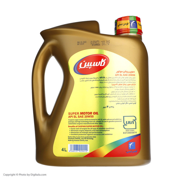 شرکت «کاسپین» از جمله تولیدکنندگان مطرح فرآوردههای نفتی است. این شرکت محصول فوق را اخیرا تحت عنوان مدل «Super Motor Oil» به بازار عرضه کرده است. این محصول یک روغن موتور خودروی باکیفیت با فرمولاسیون پیشرفته است. این امر باعث میشود تا بتواند از موتور خودرو در برابر سایش، خوردگی و اکسیداسیون محافظت کند. گرانروی یکی از مهمترین مشخصههای روغن است که باید بههنگام انتخاب روغن موتور به آن توجه ویژهای داشت. معمولا رانندگان میزان گرانروی روغن موتور را با توجه به شرایط آب و هوایی یا دمای عملیاتی موتور خودرو انتخاب میکنند. این روغن موتور با توجه به استاندارد SAE، میزان گرانروی برابر با 20W-50 دارد. این میزان گرانروی برای شرایط آب و هوایی گرمسیری و موتورهای حرارت بالا بسیار مناسب است. از لحاظ سطح کیفیت هم با توجه به استاندارد API، این محصول از سطح کیفیت SL/CF برخوردار است که در مقایسه با سطح کیفیت SN، مقداری کمتر اما مناسب محسوب میشود.